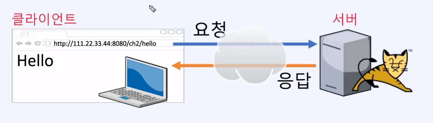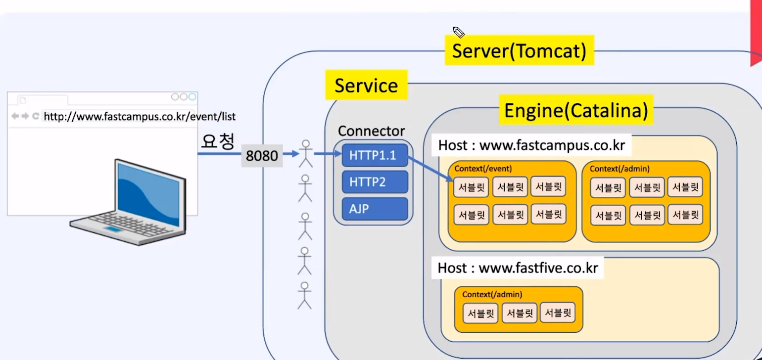browser -> URL을 입력 해서 -> request(요청) 하면 -> 해당 서버에 있는 Tomcat이 요청을 받아서 -> ㅁㅁ 객체저장