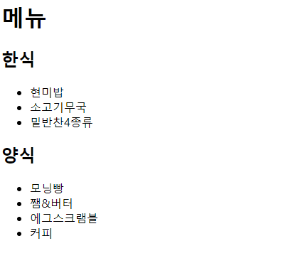 | hn요소 | 제목을 표현함(h1~h6) | <h1>제목입니다</h1> |