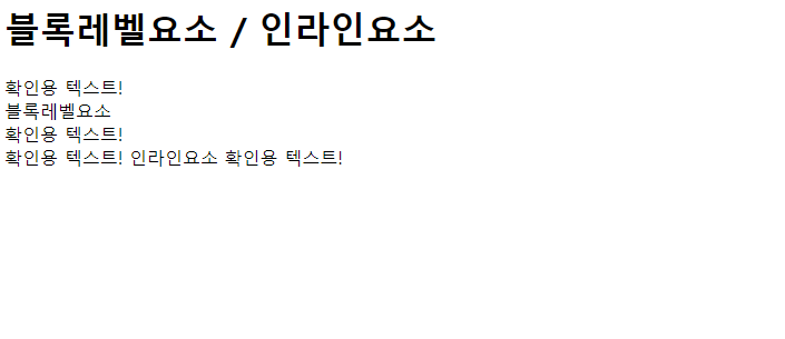 | 블록레벨 요소 | <p>문단입니다.</p> | 요소의 실제 영역이 결과화면의 가로1줄을 모두 차지합니다. 그러므로 시작전후로 줄바꿈이 있습니다. 레이아웃에 사용됩니다. |