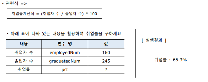 Quiz2. 취업률을 계산하는 식을 사용하여 아래의 출력결과처럼 실행되는 프로그램을 작성하세요.