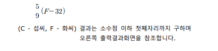 Quiz3. 출력결과를 참조하여 입력받은 화씨 온도(℉)를 섭씨 온도(℃)로 계산하는 프로그램을 작성하세요.