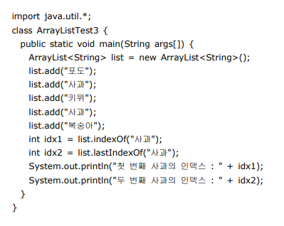 | lastIndexOf(); | 동일한 값을 갖는 마지막 데이터의 인덱스 리턴 | list.lastIndexOf("키위"); |