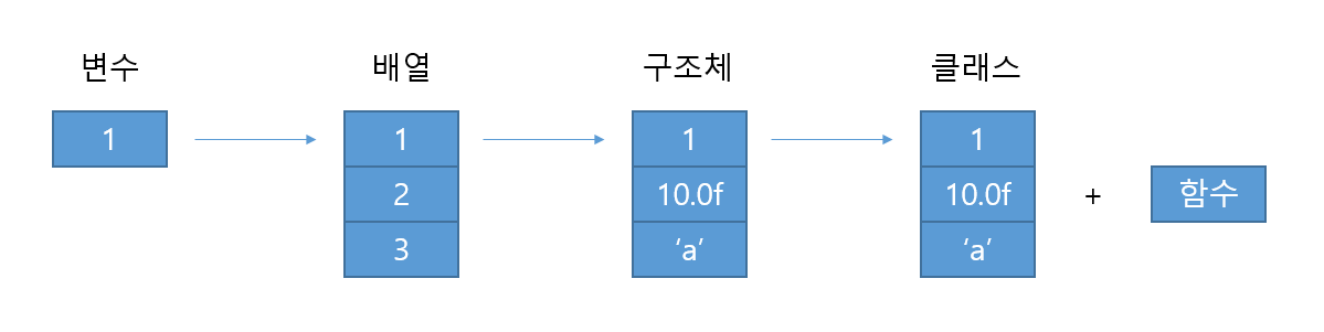 d. 클래스 : 서로 관련 있는 데이터와 함수(명령문 묶음)의 결합(구조체 + 함수)