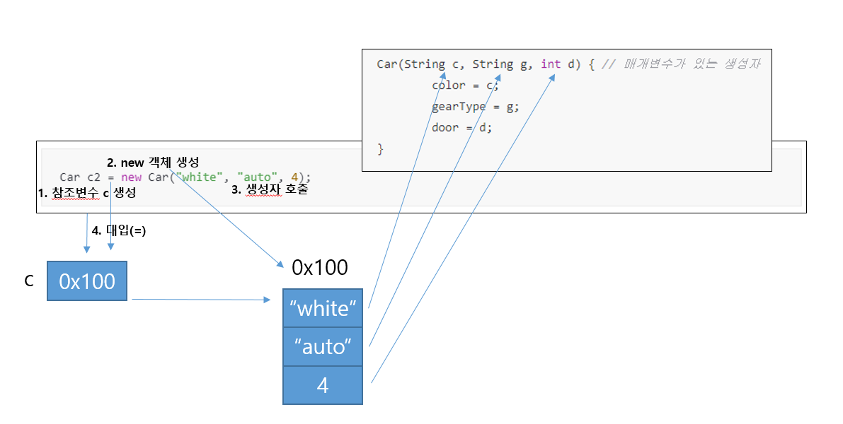 System.out.println("c2의 color=" + c2.color + ", gearType=" + c2.gearType+ ", door="+c2.door);