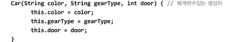 Car(String c, String g, int d) { // 매개변수가 있는 생성자