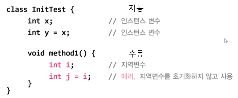 반면 인스턴스 변수는 선언과 동시에 0으로 초기화되기 때문에 값이 없더라도 에러가 발생하지 않는다.