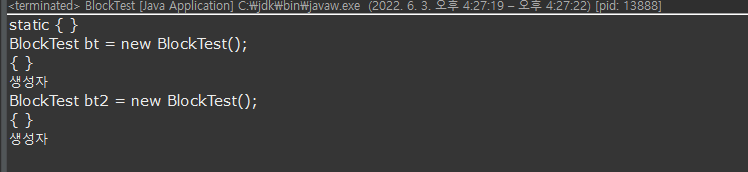 System.out.println("BlockTest bt2 = new BlockTest(); ");
