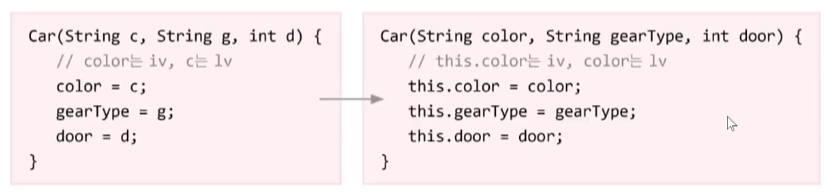 - 지역변수(lv)와 인스턴스 변수(iv)를 구별할 때 사용