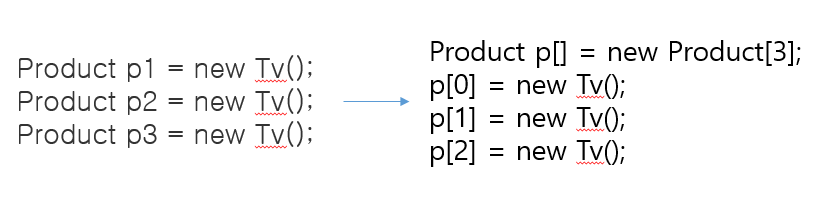 - 조상타입의 배열에 자손들의 객체를 담을 수 있다.