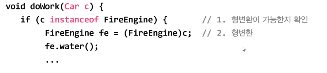 FireEngine fe = (FireEngine)c; // 실제 가르키는 인스턴스가 중요하다.