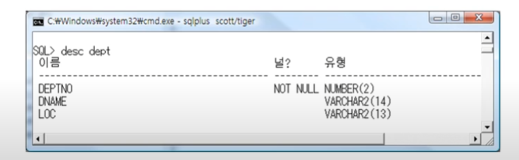 | 형식 | DESC DEPT(테이블명) ---- DEPT 테이블의 구조 살피기 |