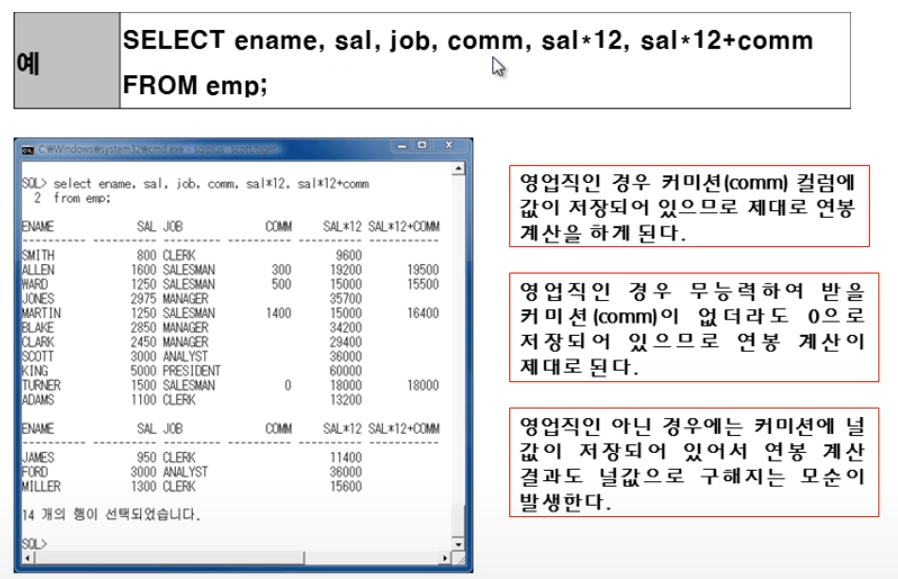 ■ 다음은 산술 연산자를 이용해서 연봉을 계산하는 쿼리문으로 앞에서 구했던 예제에서 커미션을 연봉 계산에 추가해 본 것입니다. 커미션의 경우에는 NULL값을 가진 행도 있으므로 NULL 값을 가진 데이터와 산술 연산하면 어떤 결과가 나오는지 확인할 수 있는 좋은 예제입니다.