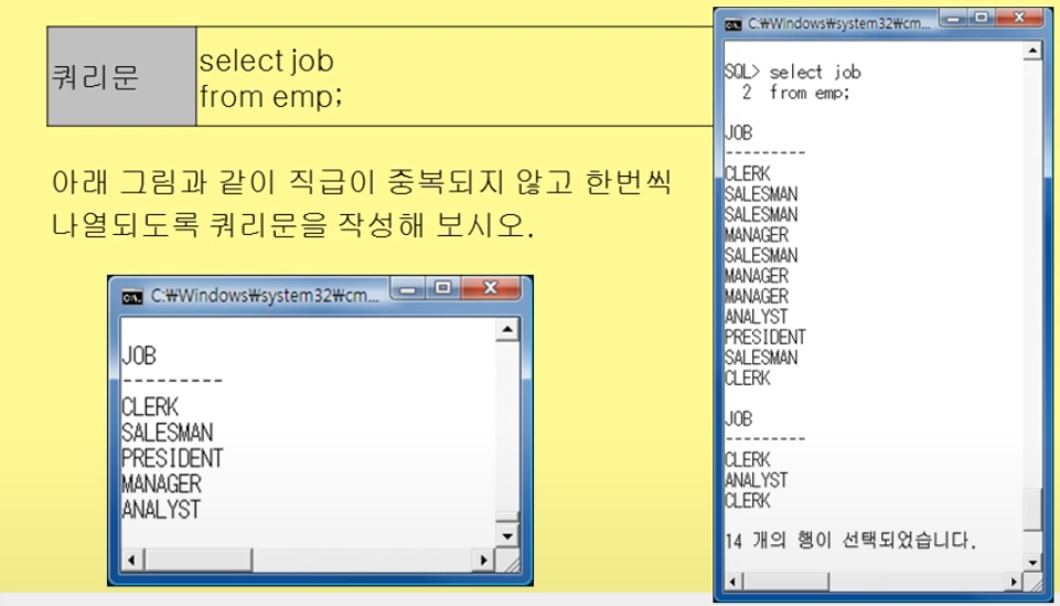 2. 사원 테이블에 존재하는 직급의 종류를 출력하기 위해서 다음과 같은 쿼리문을 수행하면 화면 왼쪽 그림과 같이 중복된 내용이 출력됩니다.