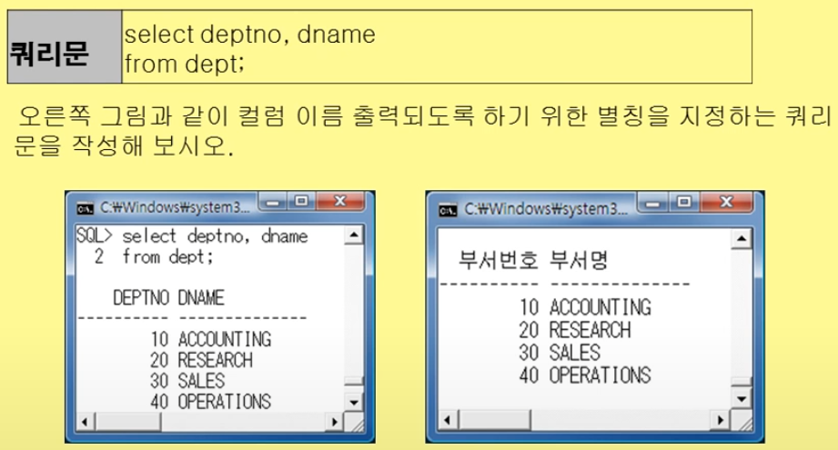 ■ 오라클에서 한글을 지원하므로 별칭이 아닌 테이블을 생성할 때 컬럼을 설정하면서 컬럼 이름도 한글로 부여할 수 있습니다.