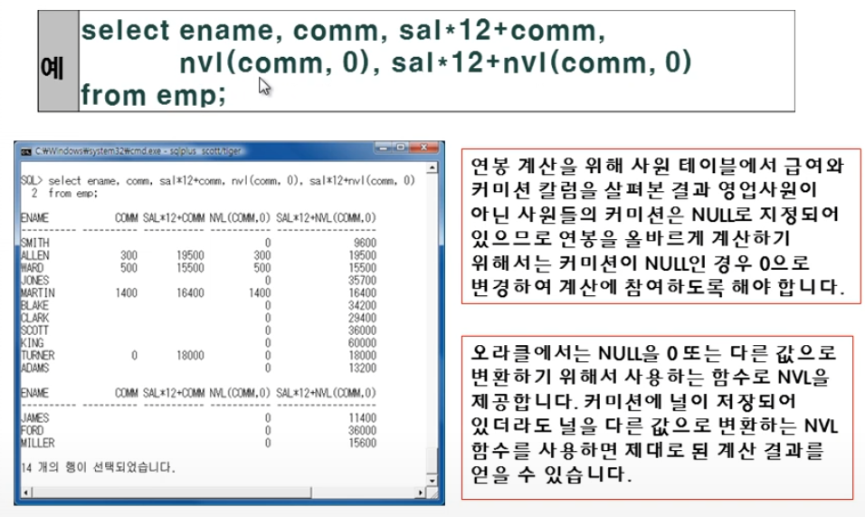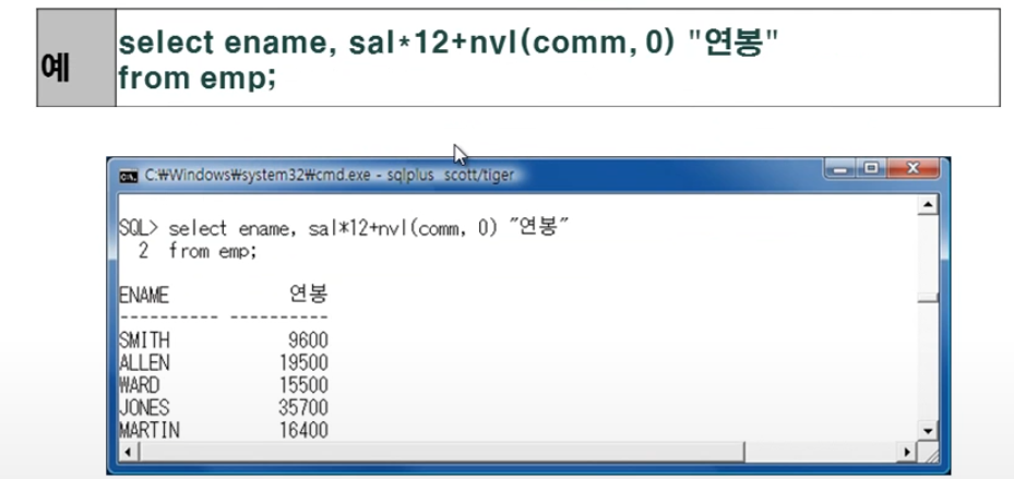 ■ nvl(comm, 0)함수의 기능 : comm이라는 변수에 null값이 들어가 있다면 0또는 다른값으로 변환.