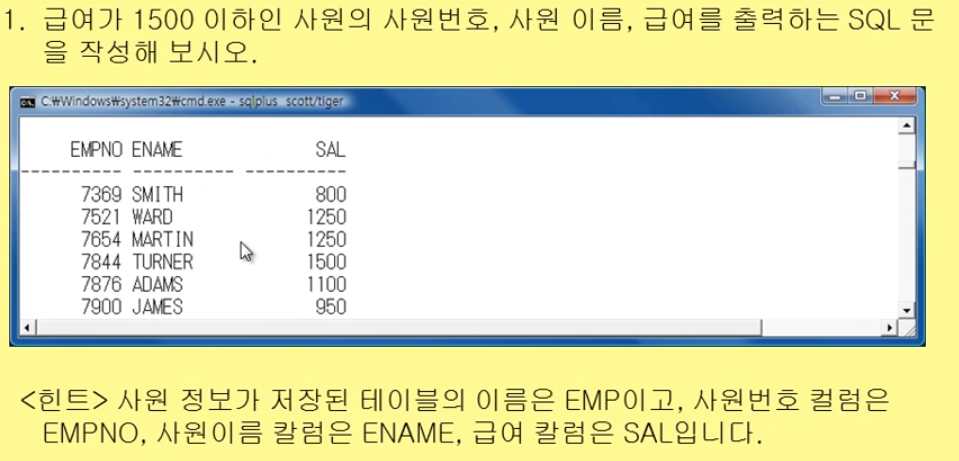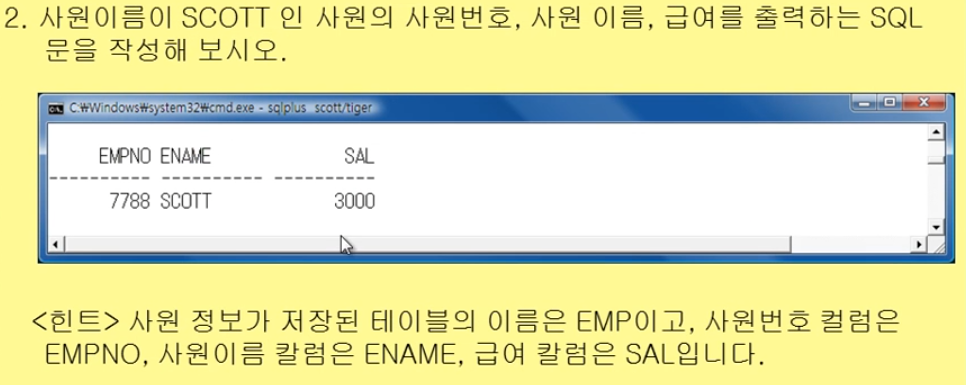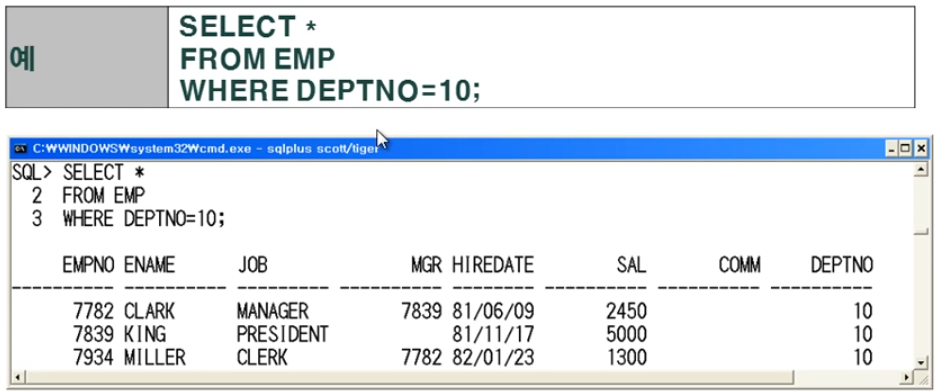 | 예 | SELECT EMPNO, ENAME, SAL FROM EMP WHERE ENAME = 'FORD'; -- 사원 이름이 FORD인 경우 출력. |