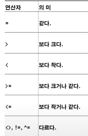 | 3 | 비교연산자(<, >, <=, =>, <>(!=), =) |