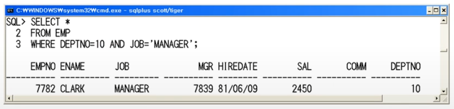 | 예 | SELECT * FROM EMP WHERE DEPTNO=10 AND JOB='MANAGER'; |
