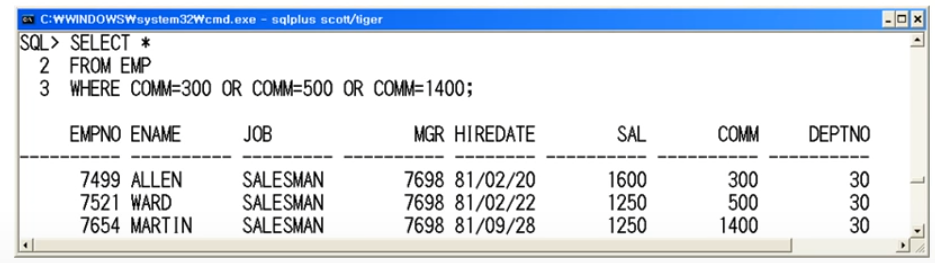 | 예 | SELECT * FROM EMP WHERE COMM=300 OR COMM=500 OR COMM=1400; |