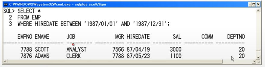 | 예 | SELECT * FROM EMP WHERE HIREDATE BETWEED '1987/1/1' AND '1987/12/31' ; |