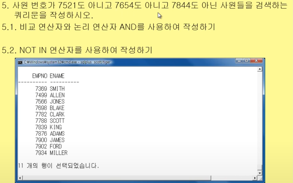 | 예 | SELECT * FROM EMP WHERE DEPTNO<>10; -- 10과 같지 않은(관계 연산자) |