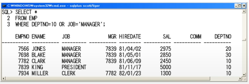 | 예 | SELECT * FROM EMP WHERE DEPTNO=10 OR JOB='MANAGER'; |