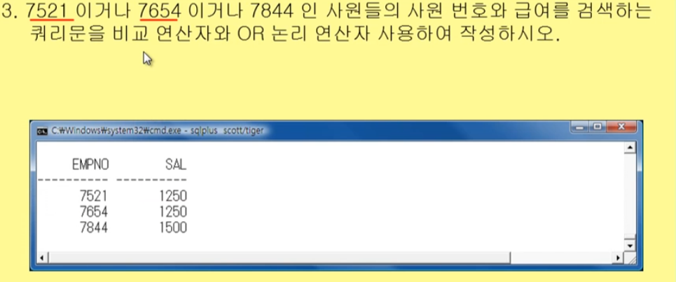 | 예 | SELECT * FROM EMP WHERE sal>=(이상)2000 AND sal<=(이하)3000 -- sal이 2000이상부터 sal이 3000이하인 것을 조회하라. |