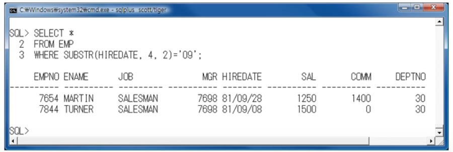 | 예 | SELECT * FROM EMP WHERE SUBSTR(HIREDATE, 4, 2) = '09'; |