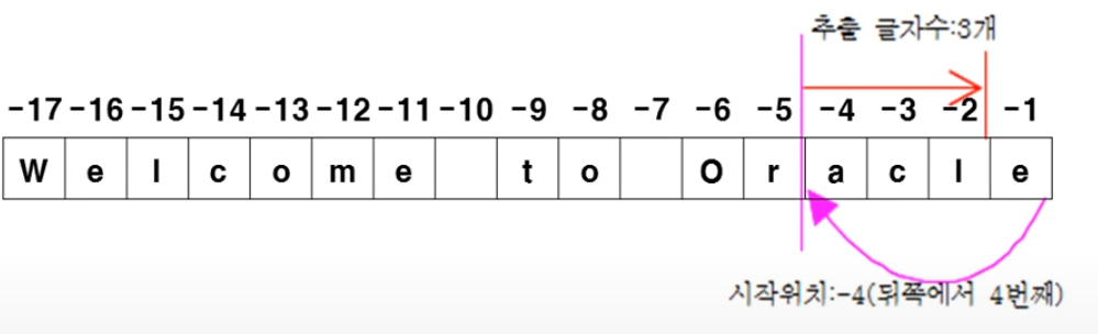 | 예 | SELECT SUBSTR('Welcome to Oracle', -4, 3) FROM DUAL; |