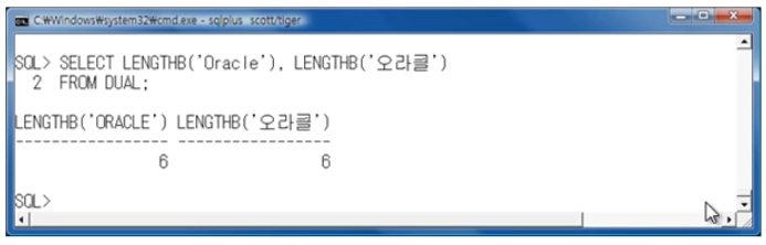 ■ 한글 1자는 2바이트를 차지합니다. 그렇기 때문에 수행 결과를 보면 한글 3자로 구성된 '오라클'의 LENGTHB함수의 결과는 6이 됩니다.