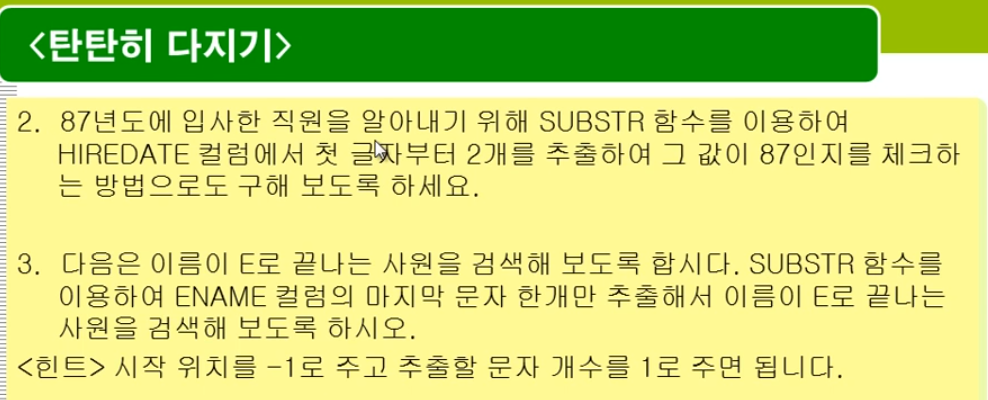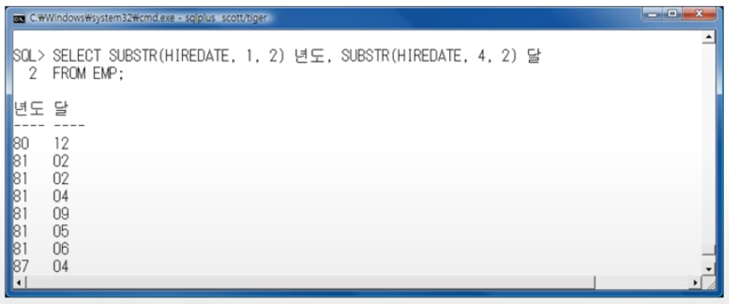 | 예 | SELECT SUBSTR(HIREDATE, 1, 2) 년도, SUBSTR(HIREDATE, 4, 2) 달 FROM DUAL; |