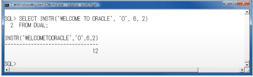 | 예 | SELECT INSTR('WELCOME TO ORACLE', 'O', 6, 2) FROM DUAL; -- 6번째 자리에서 2번째 발견된 O의 위치. |
