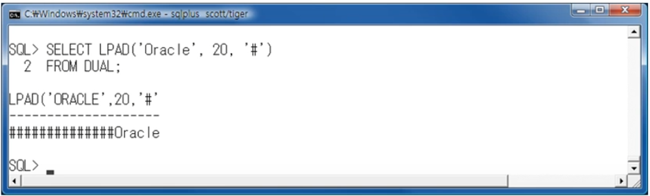 | 예 | SELECT LPAD('Oracle', 20, '#') -- 20자리중 앞자리 14개에 #을 채우고 나머지 6자리에 oracle FROM DUAL; |