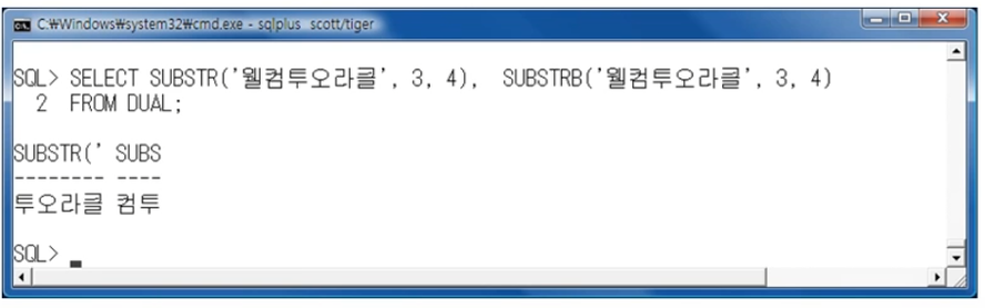 | 예 | SELECT SUBSTR('월컴투오라클', 3, 4), SUBSTRB('월컴투오라클', 3, 4) FROM DUAL; |
