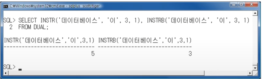 | 예 | SELECT INSTR('데이터베이스', '이', 3, 1) INSTRB('데이터베이스', '이', 3, 1) FROM DUAL; |