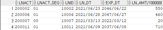 select lnact, lnact_seq, lnid, ln_dt, exp_dt, ln_amt/1000000