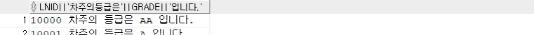SELECT lnid || ' 차주의 등급은 ' || grade || ' 입니다.'