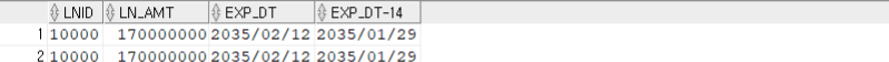 SELECT lnid, ln_amt, exp_dt, exp_dt - 14