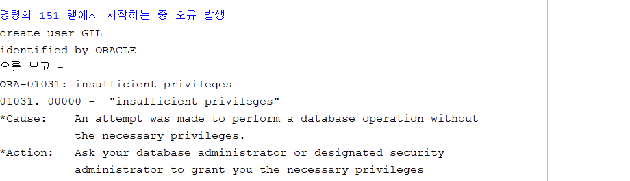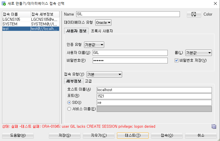 • 사용자 GIL은 CREATE SESSION 권한을 가지고 있지 않습니다. 로그인이 거절됨.