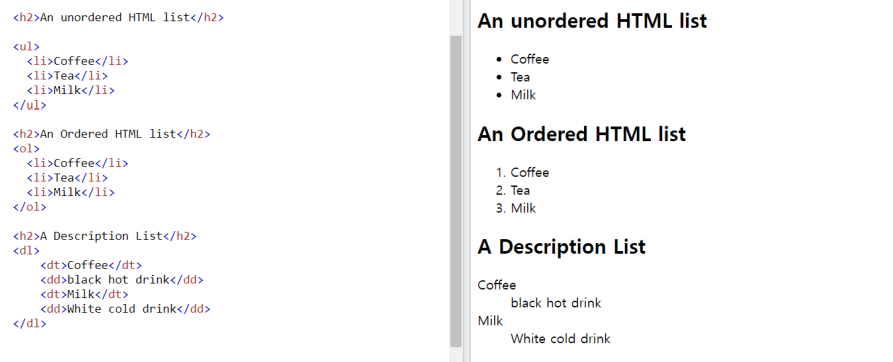| <ul>, <ol>, <li>, <dl>, <dt>, <dd> |