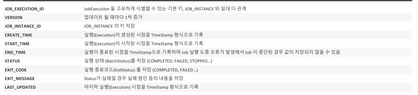 - job의 실행정보가 저장되며 Job 생성, 시작/종료 시간, 실행상태, 메세지 등을 관리.