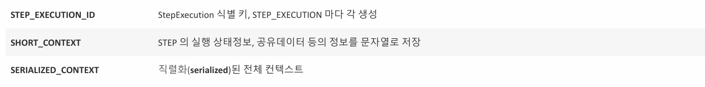 - Step의 실행정보가 저장되어 생성, 시작/종료 시간, 실행상태, 메시지 등을 관리.