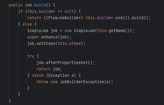 4. 따라서 내려가다보면 Job build() 메서드가 보이는데 여기서 SimpleJob 객체를 생성한다.