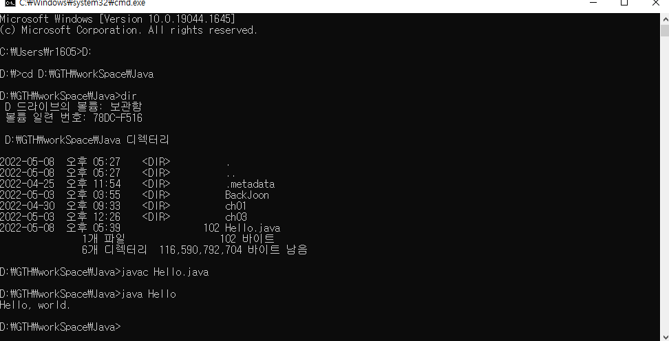 cd D:\GTH\workSpace\Java -> change directory 해당 디렉터리로 이동하겠다.