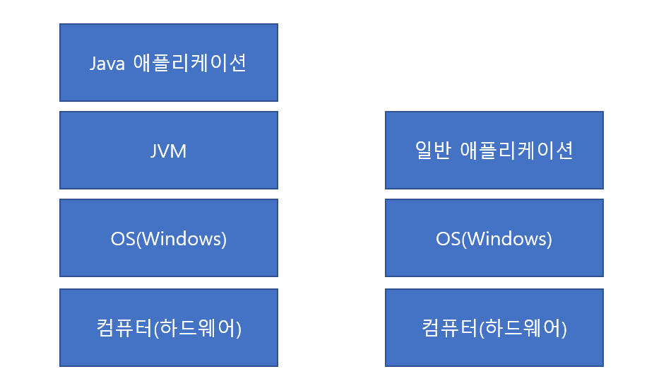 근데 요즘엔 바이트코트(컴파일된 자바코드)를 하드웨어의 기계어로 바로 변환해주는 JIT컴파일러와 향상된 최적화 기술이 적용되어서 속도의 격차를 많이 줄였다. 위 사진에서 볼 수 있듯이 일반 애플리케이션은 OS와 바로 맞붙어 있기 때문에 OS에 종속적(어떤 것에 딸려 붙어 있음)이다. 그래서 다른 OS에서 실행시키기 위해서는 애플리케이션을 당신의 OS에 맞게 설치해주어야 한다. Java 애플리케이션은 JVM하고만 상호작용해서 OS와 하드웨어에 독립적이라 다른 OS에서도 프로그램의 변경없이 실행이 가능한 것이다. 단, JVM은 OS에 종속적이기 때문에 해당 OS에서 실행가능한 JVM이 필요하다.