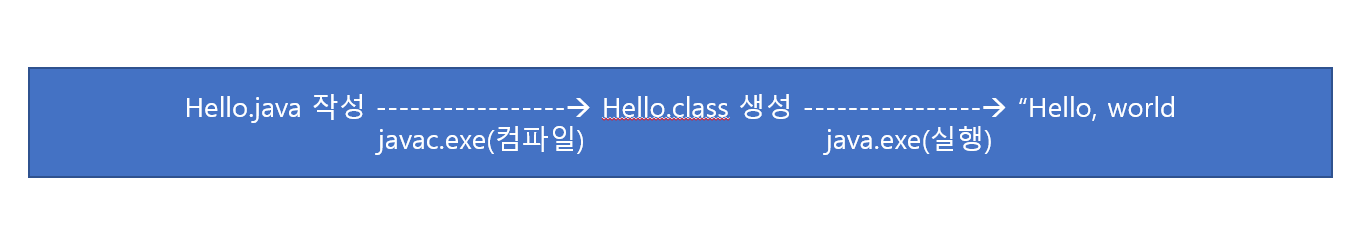 javac Hello.java -> 자바 컴파일러를 사용해서 소스파일(Hello.java)로 부터 클래스 파일(Hello.class)을 생성한다.