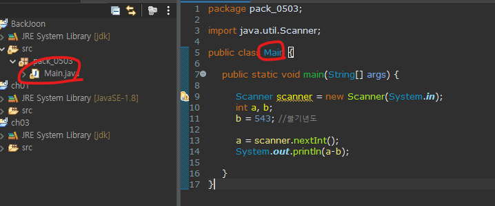 아래 코드의 'public static void main(String[] args)'는 main메서드의 선언부인데, 프로그램을 실행할 때 'java.exe'에 호출될 수 있도록 미리 약속된 부분이므로 항상 똑같이 적어주어야 한다.
